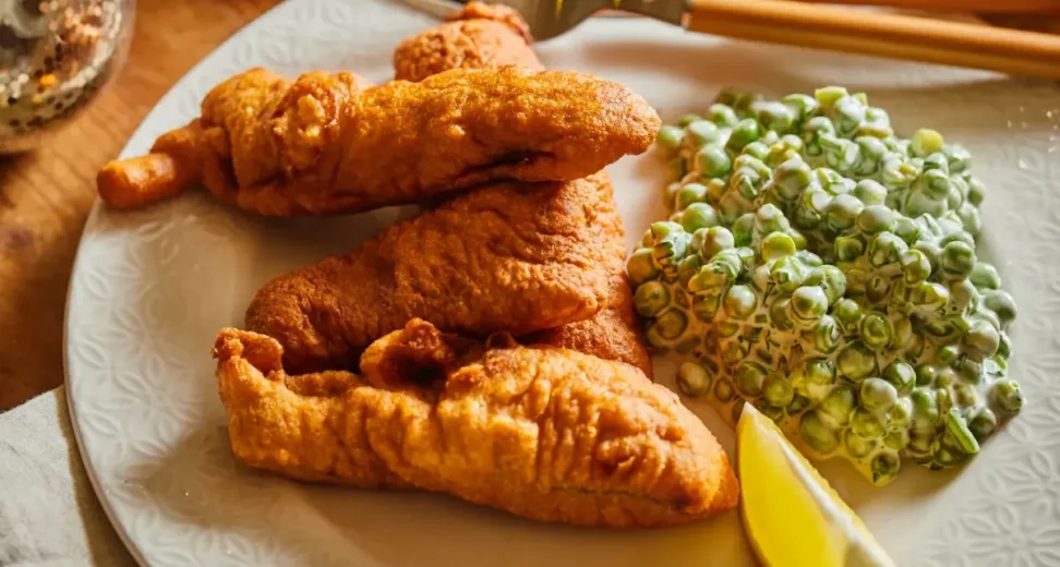 Diós bundában sütött pontyrudacskák majonézes zöldborsósalátával