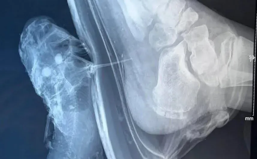 Meghökkentő röntgenfotót osztott meg Facebook-oldalán a Tisza Horgászegyesület. A képen egy gumicsizmás láb és egy törpeharcsa látható, utóbbinak a szúrótüskéje áthatolt a lábbeli falán.