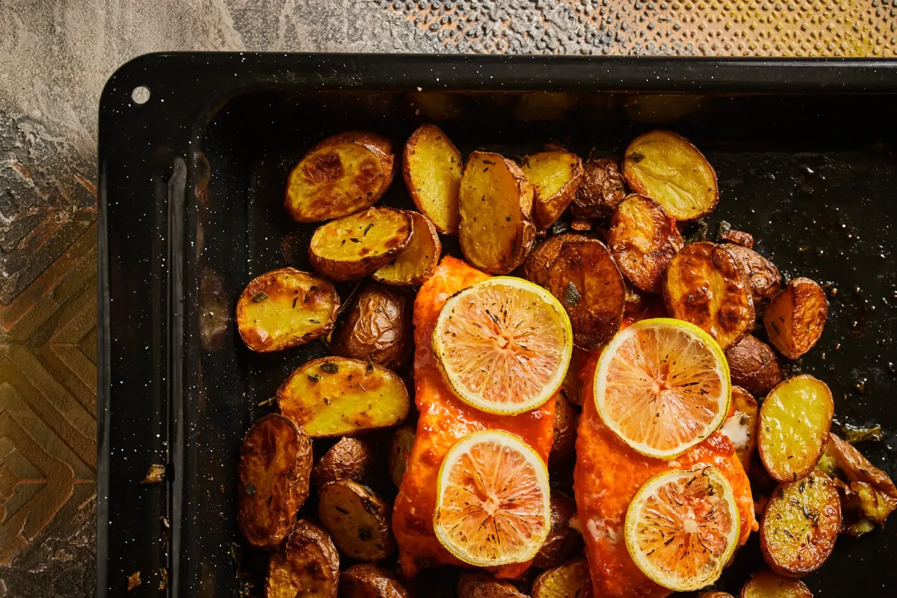 A halra kerülő páchoz egy tálban kikeverjük a mézet, a zúzott fokhagymát, a csípős pasztát, a maradék olvasztott kókuszolajat, valamint sót és borsot. Amikor már csak 10 perc van hátra a sütési időből, ezzel a páccal lekenjük a halszeleteket, és pakolunk rá pár karika citromot is. A halat ráfektetjük a burgonyára, és visszatesszük a sütőbe 10 percre, hogy készre süljön a lazac és a köret is.