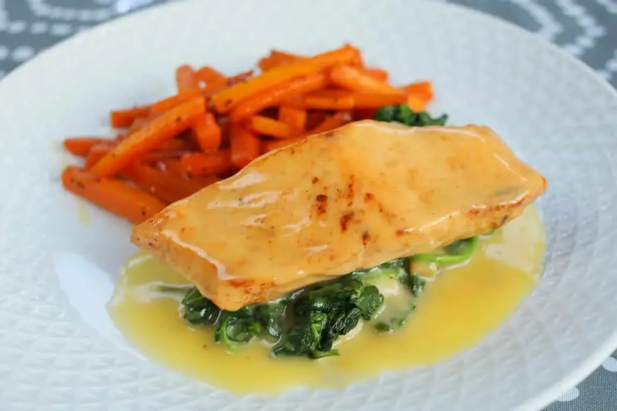 A kifilézett, szálkáitól és bőrétől megfosztott lazacot 2 szeletre vágva egy kissé vajas serpenyőbe tesszük, megsózzuk, megborsozzuk és oldalanként 1-1,5 percet sütjük úgy, hogy közben a vajjal locsolgatjuk. Egy tányérra szedünk egy adag spenótot, arra jön egy lazac, amit bőven meglocsolunk a vajmártással és mellé tálaljuk a sült répát.