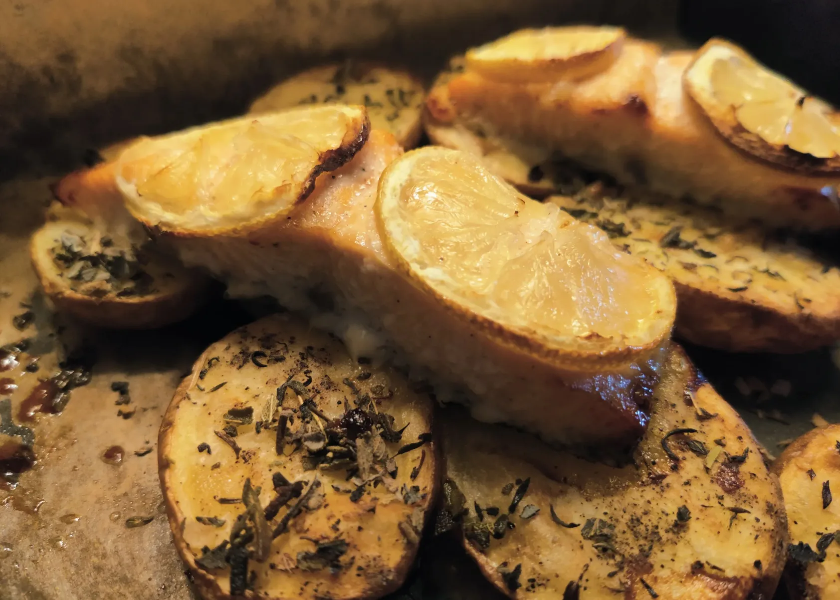 A halszeleteket befűszerezem oregánóval, fokhagymapéppel, pici sóval. Állni hagyom kb. fél órát. A burgonyákat megmosom, hosszába vágom, kis margarint teszek rá, és egy kis sót. Betekerem fóliába, és előmelegített sütőbe teszem. A halszeleteket mindkét oldalukon pirosra sütöm. A sütőben megfőtt krumplit fólia nélkül még visszateszem pirulni egy kicsit.
