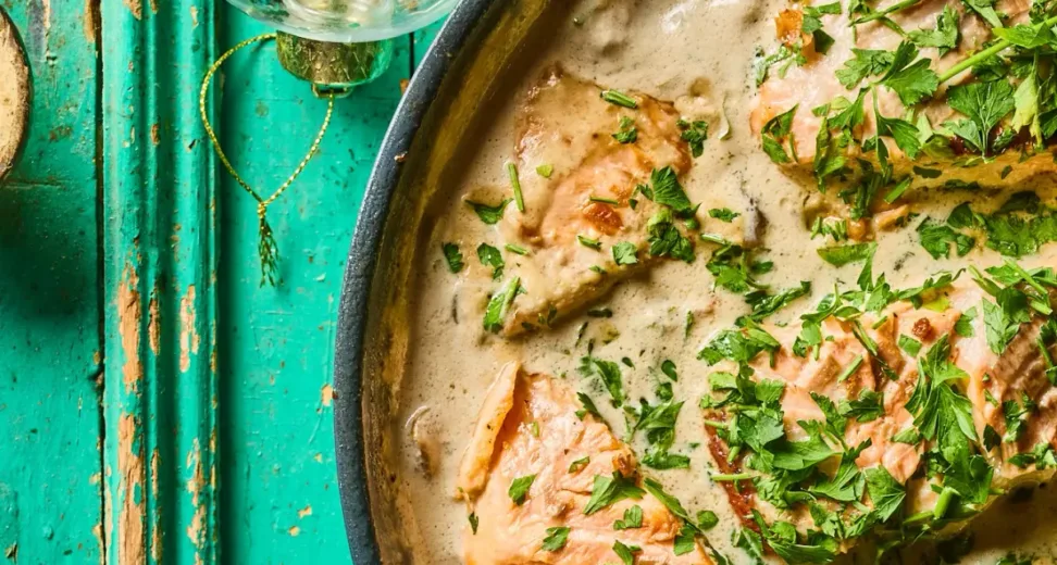 Szaftos lazac tejszínes gombával: tökéletes vacsora pillanatok alatt
