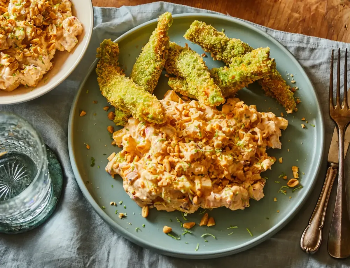 Rántott lazaccsíkok zöld bundában, csípős majonézes sültkrumpli-salátával