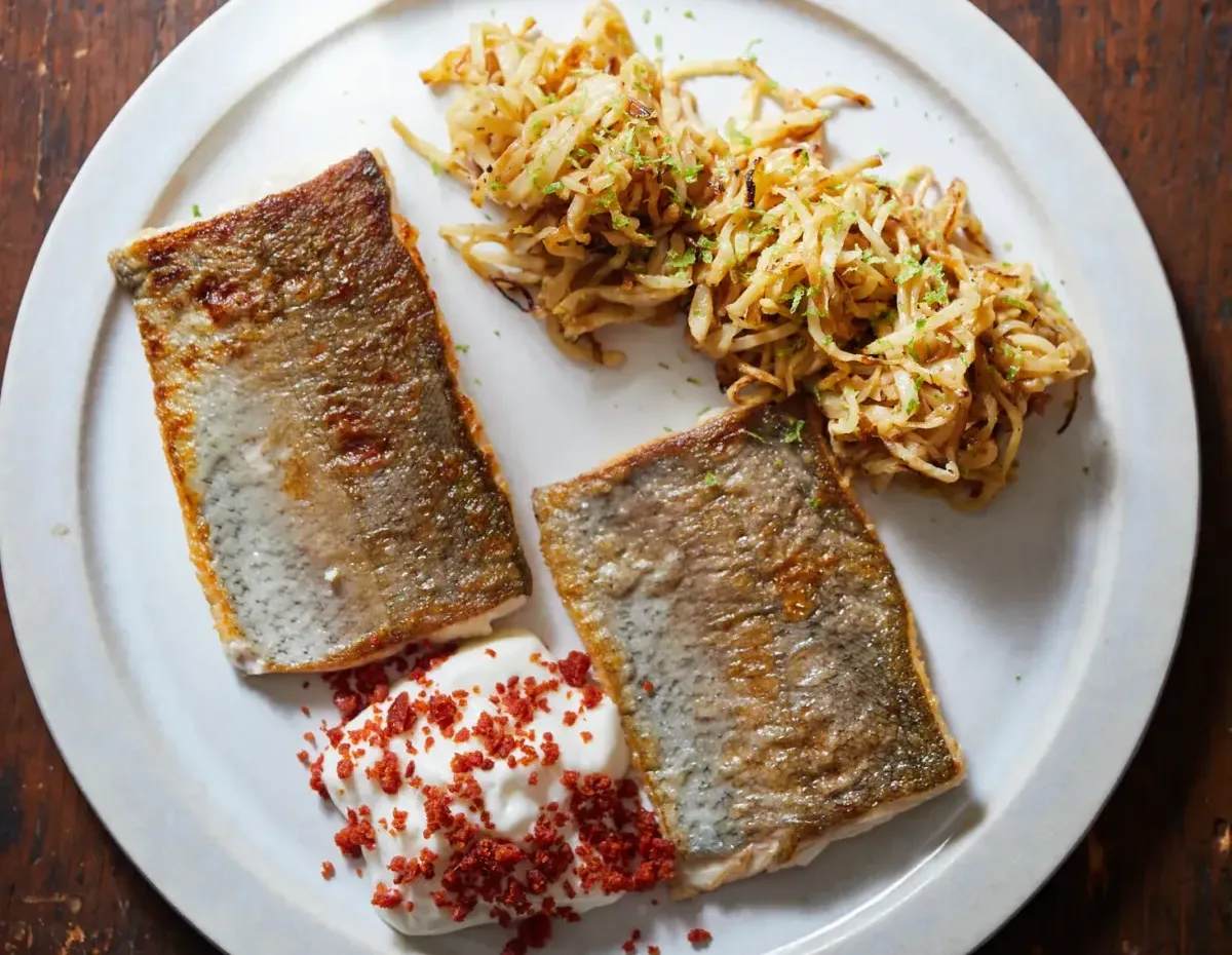 Sült pisztráng füstös zellerrel, tormahabbal és kolbászmorzsával